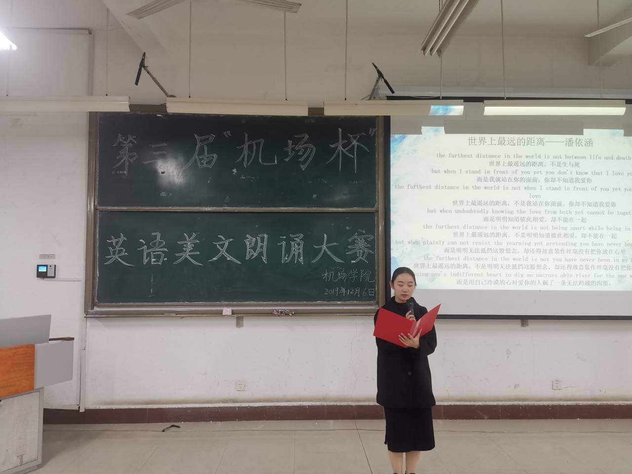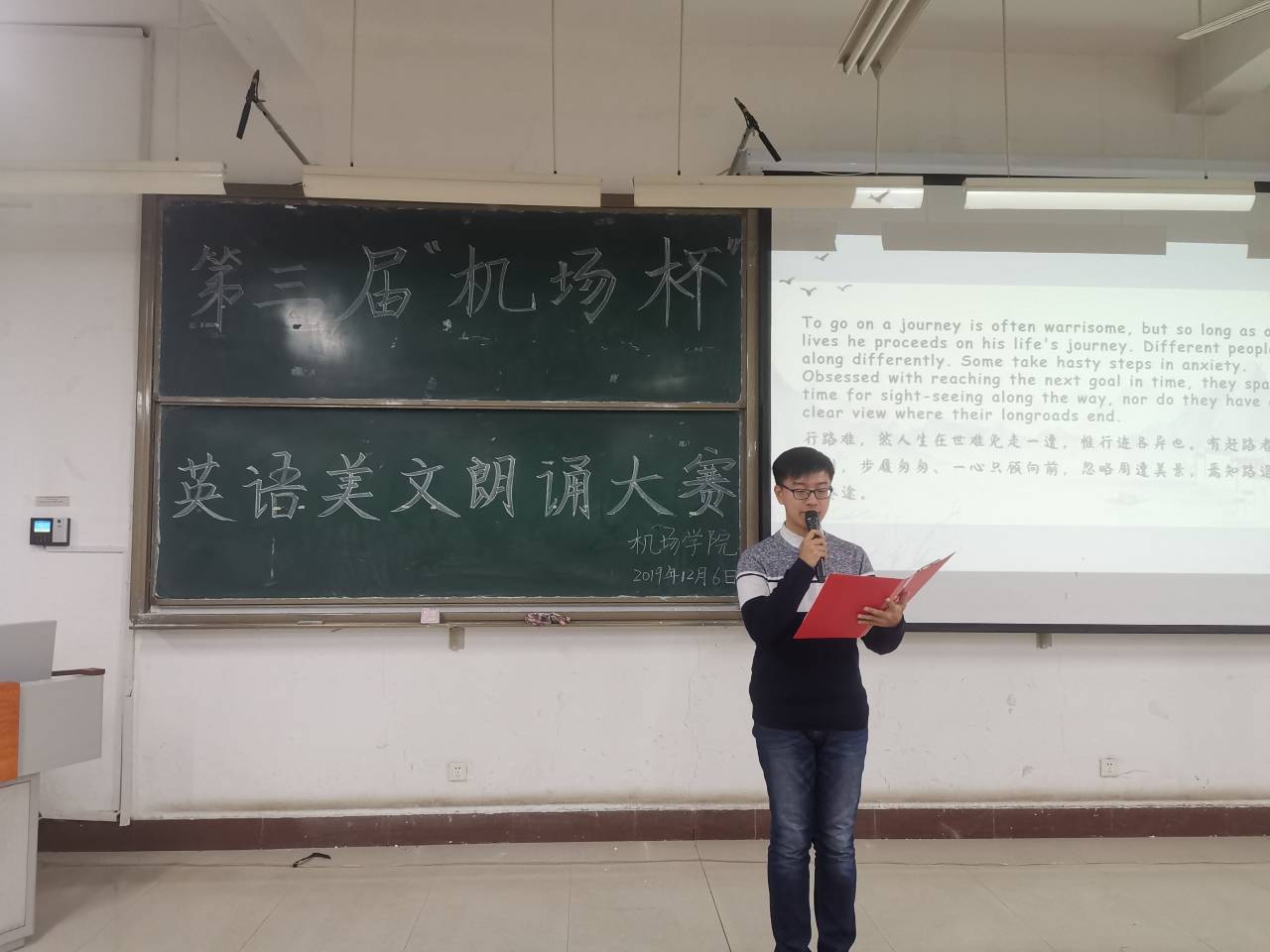 活动开始前,主持人向同学们详细介绍了此次比赛的规则,随后参赛者按照抽签次序依次上场。伴着精心准备的背景音乐和PPT,参赛选手们通过声情并茂的朗读,用标准的英语口语带领台下的观众走向英语的世界,尤其是由李晨昊带领的小组,通过不同的同学来阅读不同的语段,营造不同的环境,将文中的精彩故事呈现在观众面前。在活动接近尾声时,一场英汉语言之美的小游戏再一次将比赛推向高潮,让同学们感受到英文版诗词的魅力。经评定,李晨昊组获得一等奖,姜汶杭等小组获得二等奖,宋雨馨小组等获得三等奖,19交通1班等四个班级获得优秀组织奖。由各评委为他们颁发证书,并拍照留念,本次活动圆满结束。