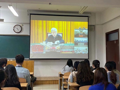 接山东省教育厅通知,为推动学生加强对国家时政的学习,贯彻落实习近平总书记指示精神,bat365中文官方网站于11月12日15:00在工科楼1-109会议室及其它教室组织部分师生收看了党的十九届五中全会精神中央宣讲团报告视频直播。