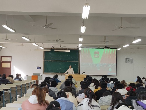 靳雪银老师为学生准备了一堂有高度、有深度、有温度的开学第一课。活动伊始,靳老师通过问题“这个寒假你是怎么度过的?”与现场同学进行互动交流,同学们积极分享自己丰富多彩的假期生活:读一本好书、参加社会实践、学习一项技能…… 靳老师对各位学生充实的假期表示认可,并通过《闪亮的名字》中“最美大学生”的先进事例、《感动中国2020年度颁奖盛典》代表人物和《脱贫攻坚表彰大会》三个板块,展现榜样精神、青春力量,引导各位同学培养榜样意识,并通过这三部“大片”号召同学们在未来的时代大潮中勇敢搏击,珍惜韶华、奋发有为,努力成为担当民族复兴大任的时代新人。