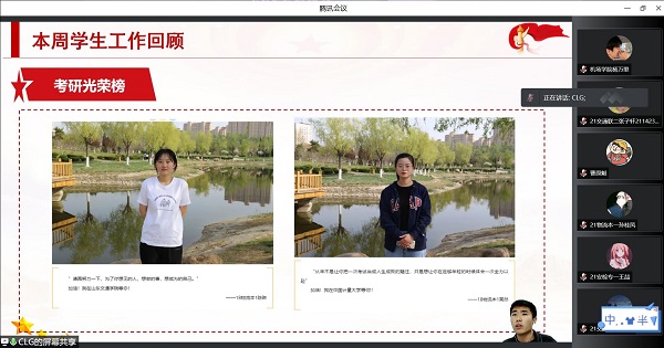 初心四问就在前,使命担当我为先。会上,辅导员老师总结了bat365官网师生在上周为抗击疫情所做出的工作与努力:组织各个宿舍进行彻底的卫生大扫除,坚持日常防疫卫生消杀,做好疫情防护措施;鼓励全体同学主动清理生活垃圾,积极建设“美丽校园防疫”;组织观看“同上一堂‘冰雪’思政大课”,引导大家感悟奥运精神,拼搏共向未来;组织各班持续开展户外素质拓展活动,致力做到校园防疫勤锻炼,增强体质促健康。随后对本周工作进行了详细部署,一是强调各班认真组织参加“预防传染病知识竞赛”及观看“生命与安全教育主题讲座”,确保100%参与率;二是各团支部有序组织2022年“五四表彰”评选工作,在广大团员青年中形成创先争优的浓厚氛围;三是全面加强劳动教育,倡导学生积极响应“文明健康绿色环保从我做起”的号召。会议最后通报了截至目前bat365官网研究生考试录取情况,并希望大家能向优秀考研学子看齐,争做表率和示范,勇敢追梦,方得始终。