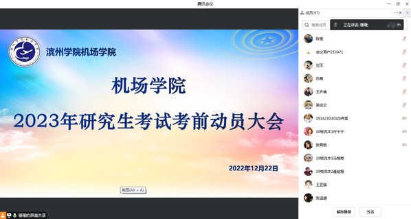 为了给考研学子加油鼓气、缓解压力,加强诚信教育,切实增强考研学子的信心与决心,12月22日,bat365中文官方网站于线上举办了2023年研究生考试考前动员大会,bat365中文官方网站党总支书记张健、院长韩春艳、副院长李永、团总支书记靳雪银、辅导员王珊珊、19级各班级班主任以及全体考研同学参加此次考前动员大会。