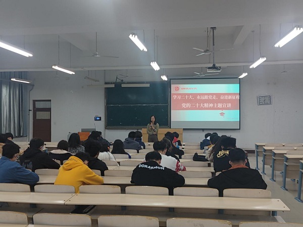 为深入学习贯彻党的二十大精神,坚持不懈用习近平新时代中国特色社会主义思想铸魂育人,11月22日下午,bat365中文官方网站开展学习党的二十大精神主题宣讲会。会议由bat365中文官方网站团总支书记靳雪银主讲,bat365中文官方网站2022级团员青年代表参加本次会议。
