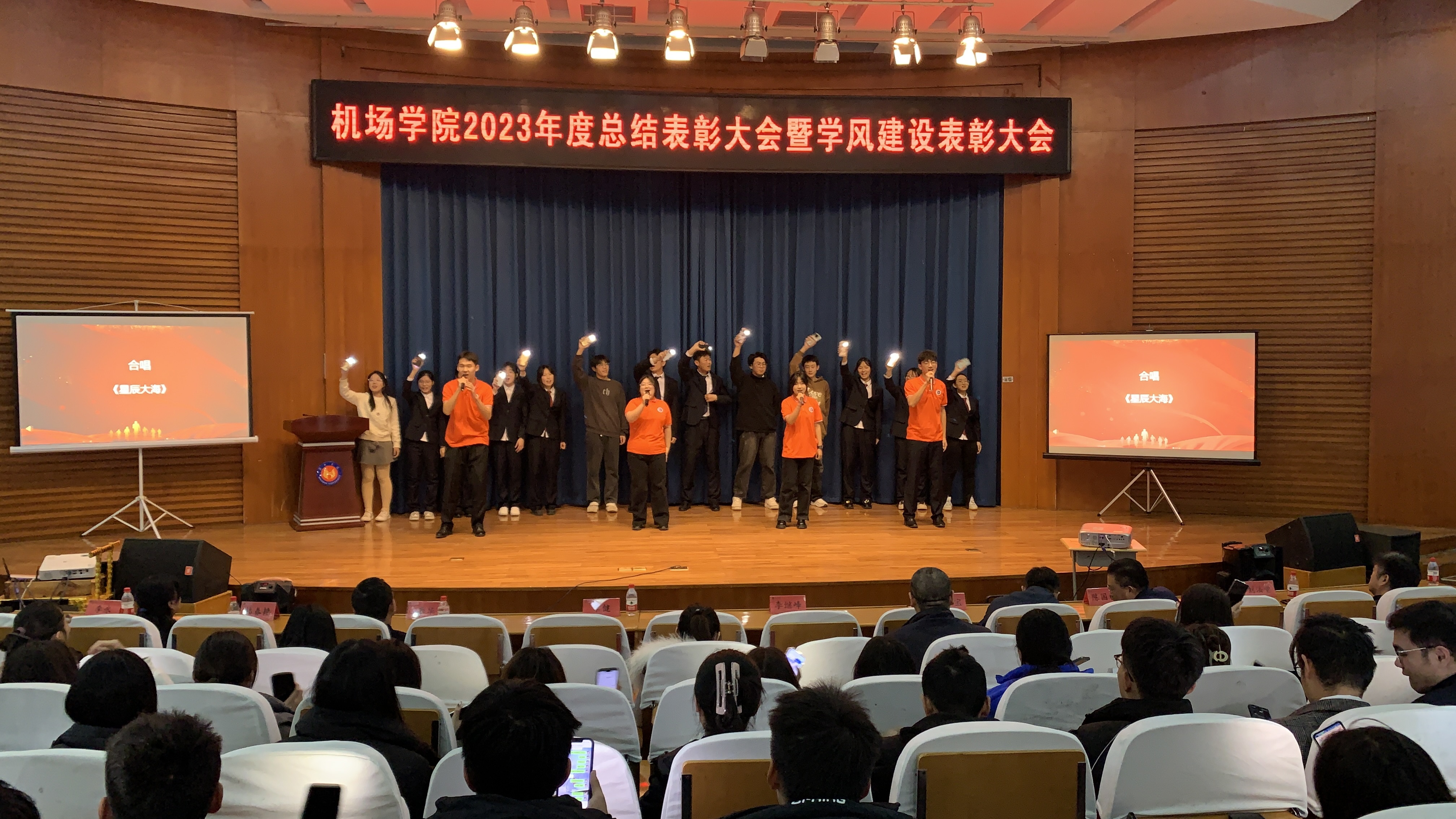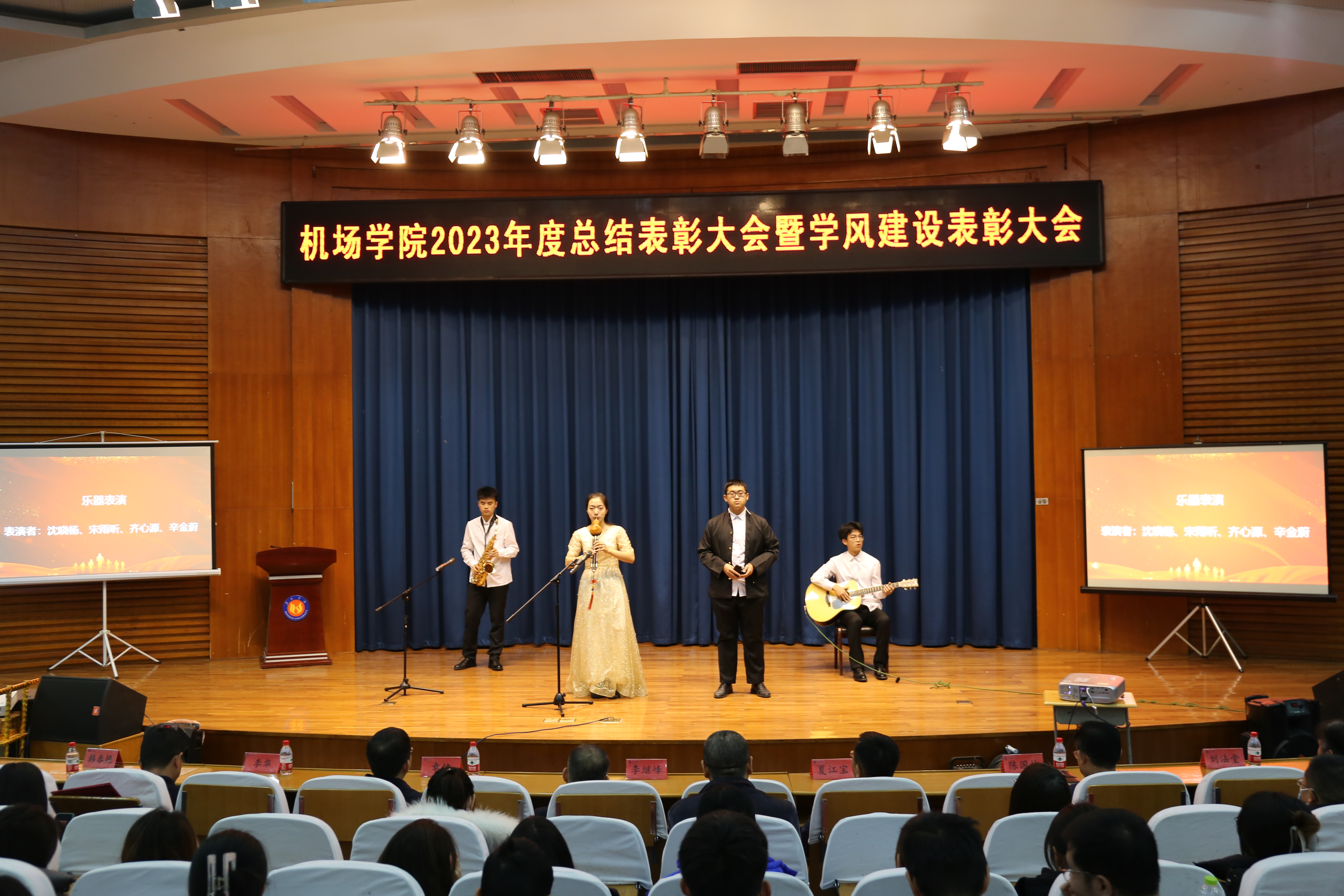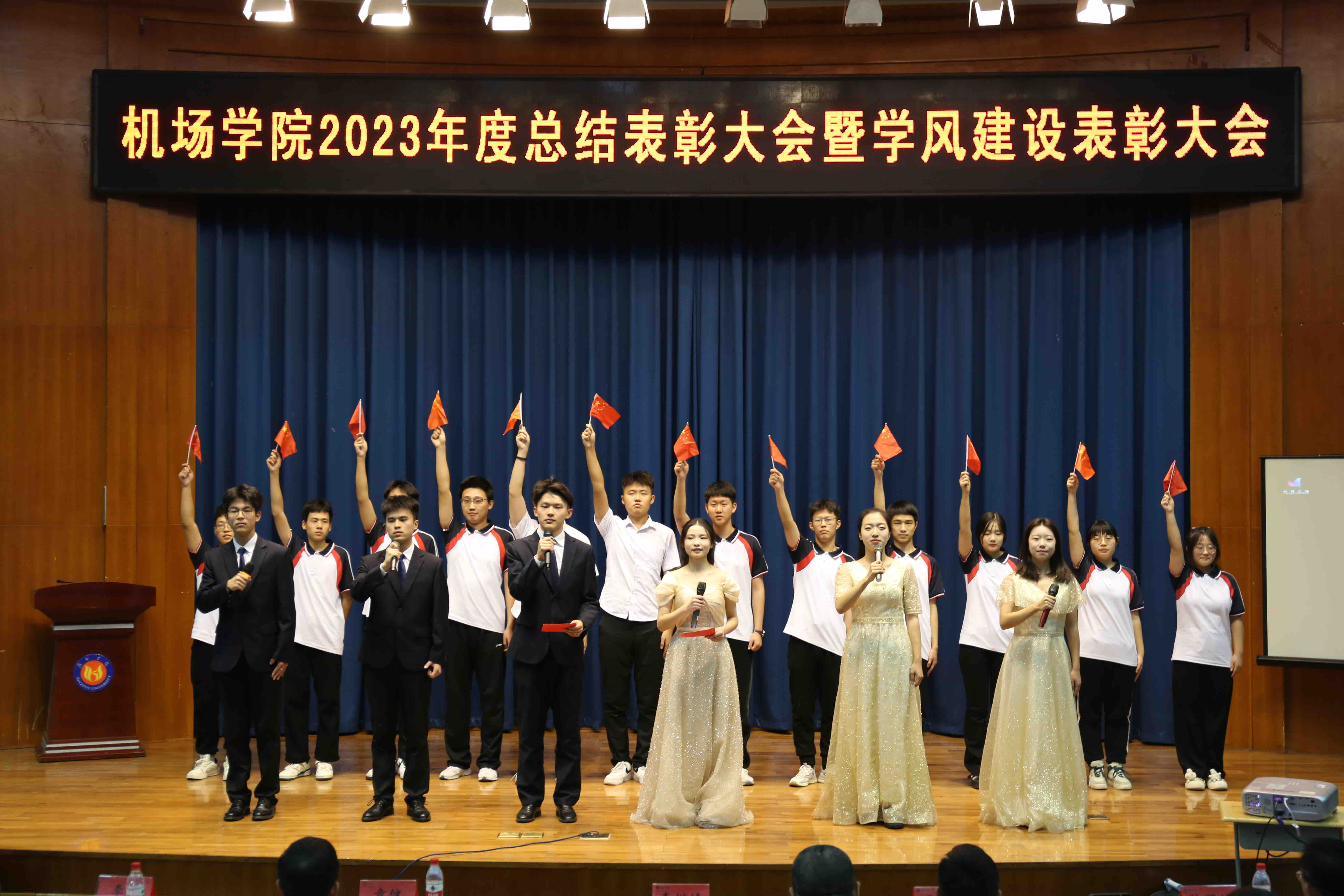 会上,同学们也带来了精彩纷呈的节目表演,乐器演奏《琴韵流转》吹弹奏出青春最好的模样,展现了机场学子对美好大学生活的向往与追求,歌曲串烧《找自己》《最美的太阳》演唱出新时代大学生的朝气与阳光,歌颂了辛勤付出的教师是最美的太阳,主题演讲《躬身探索青云志 问鼎苍穹东方红》展现了机场学子秉承航空报国精神、勇攀高峰的精神风貌,合唱《星辰大海》带你我披星戴月,共同奔赴2024全新征途。