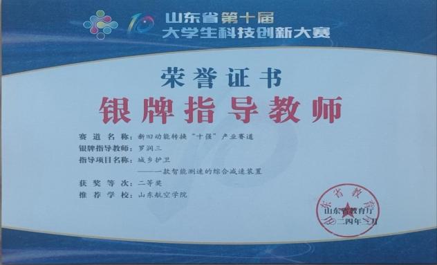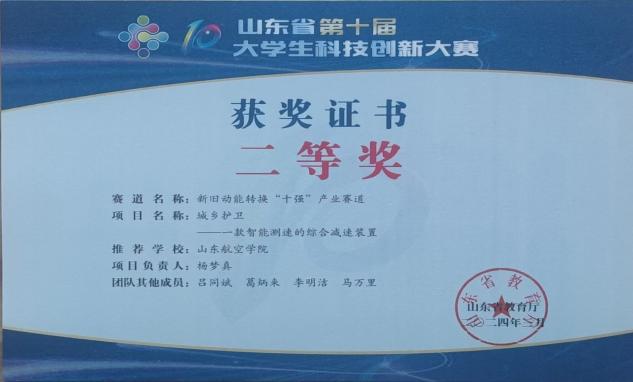 近日,山东省第十届大学生科技创新大赛圆满落幕,大赛以“创新引领未来,科技改变生活”为主题,旨在激发大学生的创新创造热情,推动科技创新成果在实际应用中的转化。bat365中文官方网站高度重视此次大赛,精心组织、周密部署,鼓励广大学子积极参与发挥专业优势,勇于探索,敢于创新。经过激烈角逐,bat365官网杨梦真同学团队的“一款智能测速的综合减速装置”荣获大赛二等奖,指导老师罗润三获银牌指导教师荣誉称号。