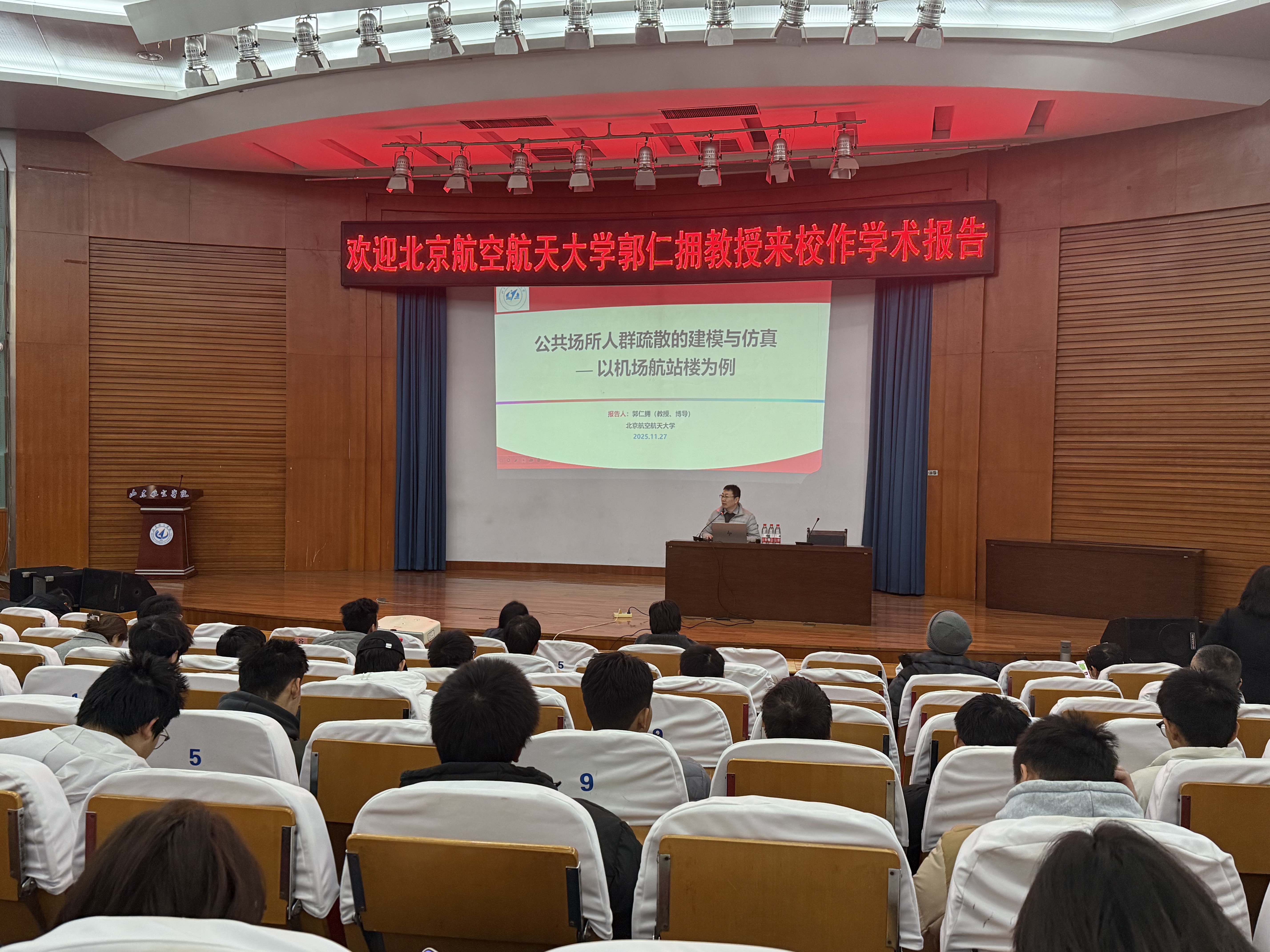 11月27日上午,北京航空航天大学郭仁拥教授应邀来我校作学术报告,报告题目为《公共场所人群疏散的建模与仿真—以机场航站楼为例》,深入解析行人疏散建模的前沿研究与应用价值。本次报告会由bat365中文官方网站科研秘书王荣娟老师主持,学院科研骨干教师和相关专业研究生、本科生参加了报告会。
